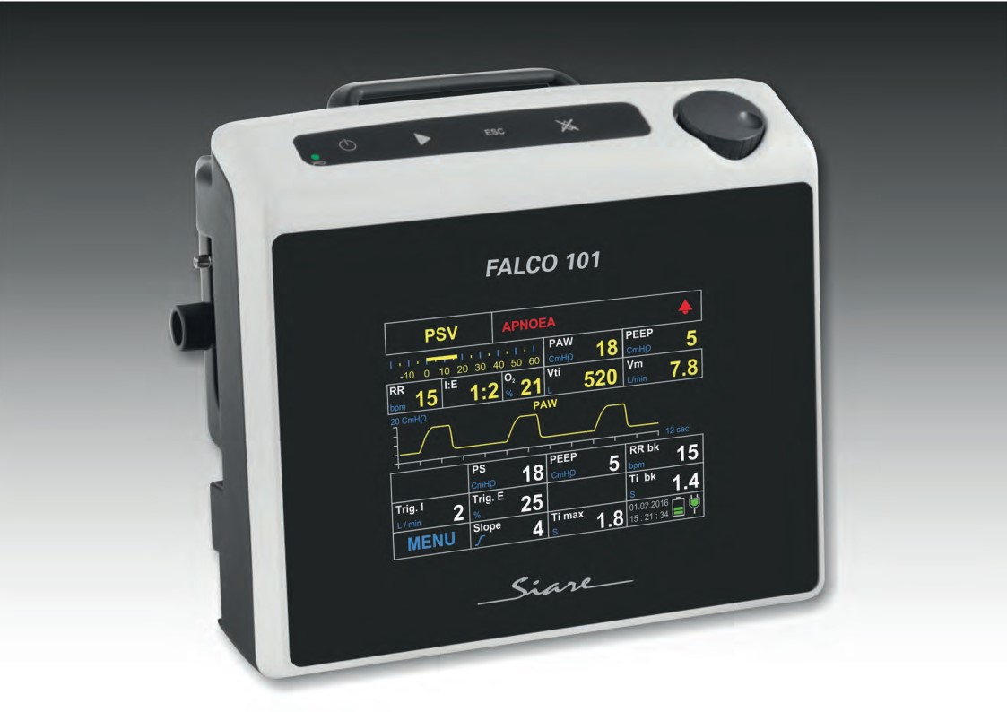 Аппарат искусственной вентиляции легких Falco 101 предназначен для госпитализированных пациентов и для пациентов, страдающих хронической дыхательной недостаточностью, получающих лечение на дому. Имеет несколько режимов искусственной вентиляции легких: контролируемое давление и спонтанная вентиляция; компенсация значительной утечки при неинвазивной вентиляции позволяет пациенту получить адекватную и оптимальную респираторную поддержку. Falco 101 представляет собой оптимальное устройство для использования в пульмонологическом стационаре и в домашних условиях.