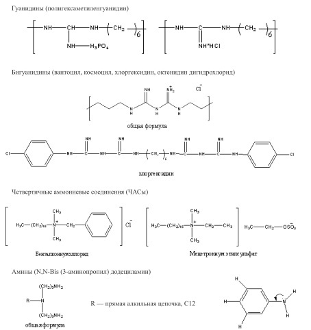 При анализе структурных формул очевидно, что катионные поверхностно-активные ЧАСы, гуани-