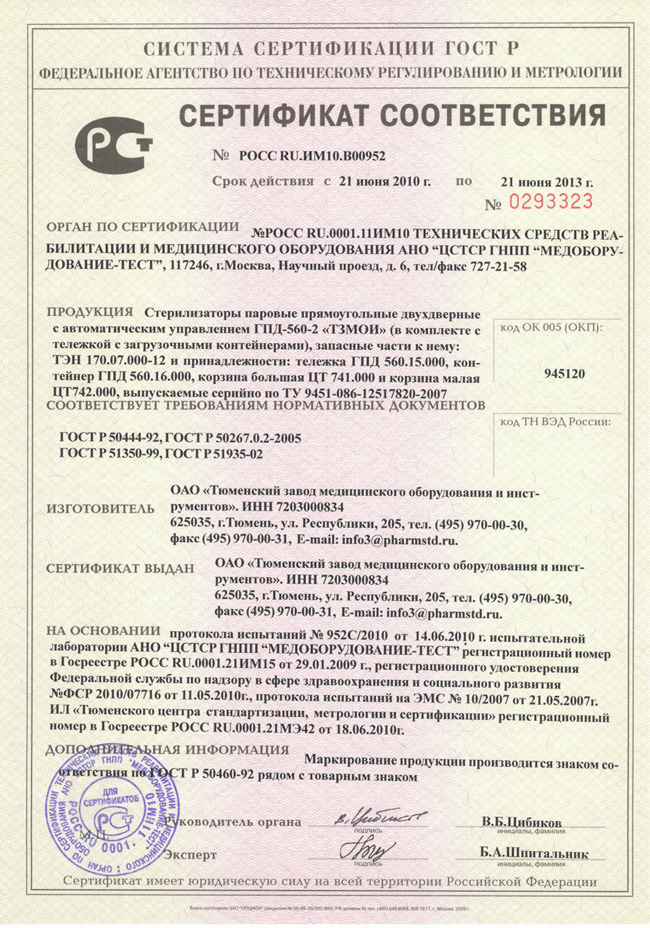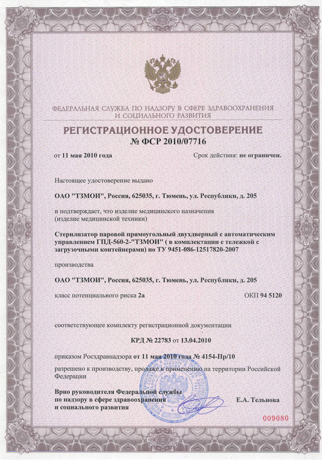 Регистрационное удостоверение на стерилизатор паровой ГПД-560-2