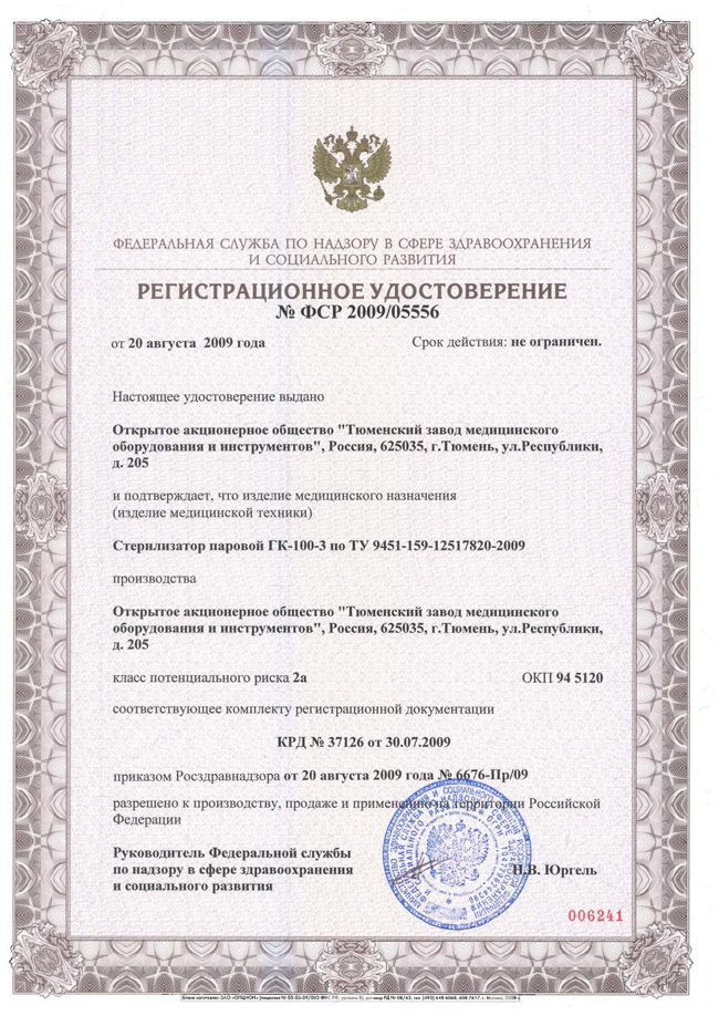 Регистрационное удостоверение на стерилизатор ГК-100-3