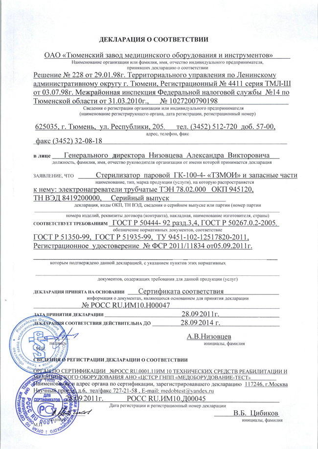 Регистрационное удостоверение стерилизатор ГК-100-4
